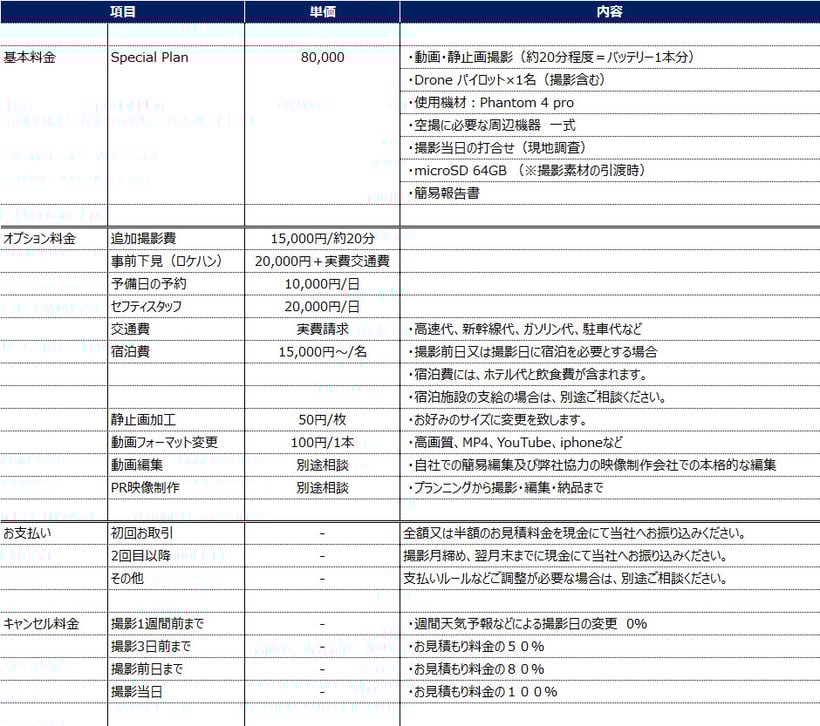 ※上記、価格表に関しましては、撮影内容・依頼内容により変動がございますので、