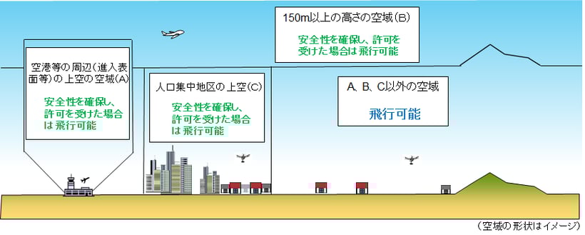 以下の(A)~(C)の空域のように、航空機の航行の安全に影響を及ぼすおそれのある空域や、落下した場合に地上の人などに危害を及ぼすおそれが高い空域において、無人航空機を飛行させる場合には、あらかじめ、地方航空局長の許可を受ける必要があります。